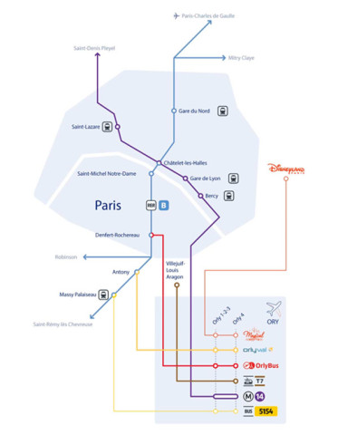 - Combined with Orlyval (change at Antony), RER B offers a rail link between Orly airport and Central Paris and stops at Denfert-Rochereau, Saint-Michel-Notre-Dame and Gare du Nord. Orlyval runs every 4 to 7 minutes between 6 am and 11 pm. The journey time is approx. 6 minutes. The RER B journey time is 25 / 30 minutes to the centre of Paris. Price: 13,25€